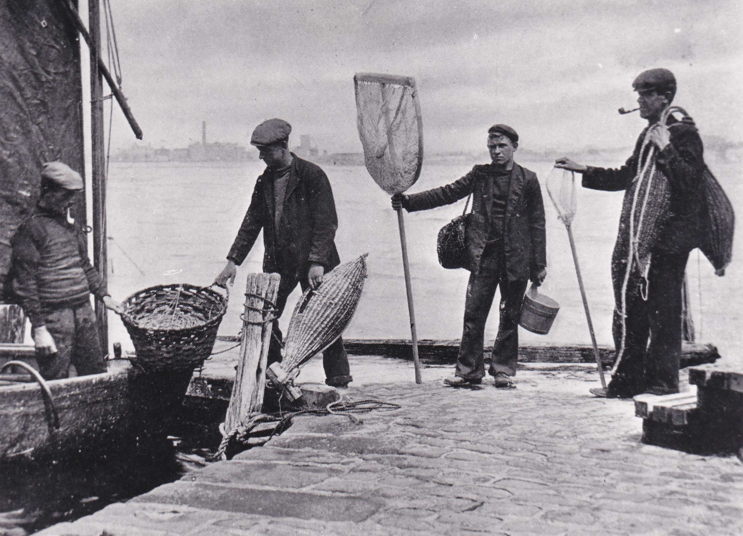 Below, photo of Guernsey fishermen with fishing baskets, credit: Le Tricoteur, Guernsey.
